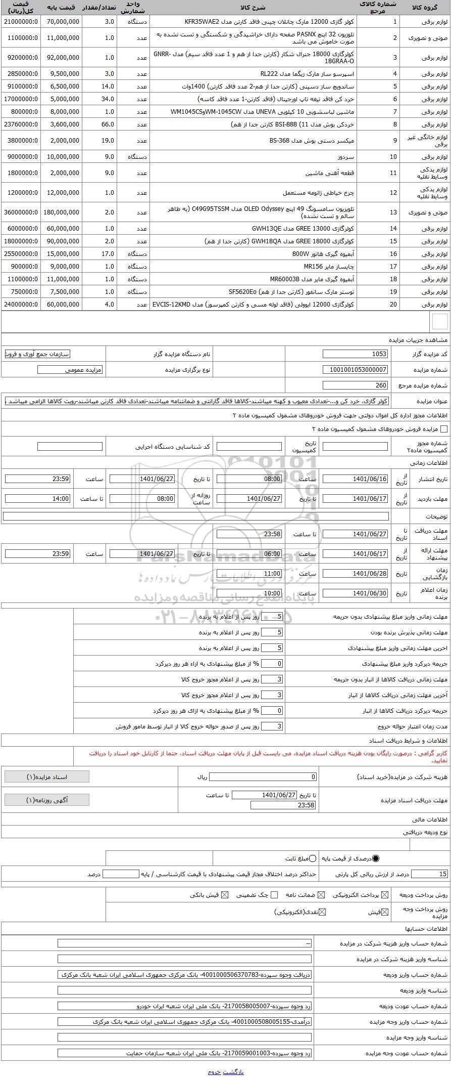 | کد مزایده گزار | 1053 | نام دستگاه مزایده گزار | سازمان جمع آوری و فروش اموال تملیکی | |