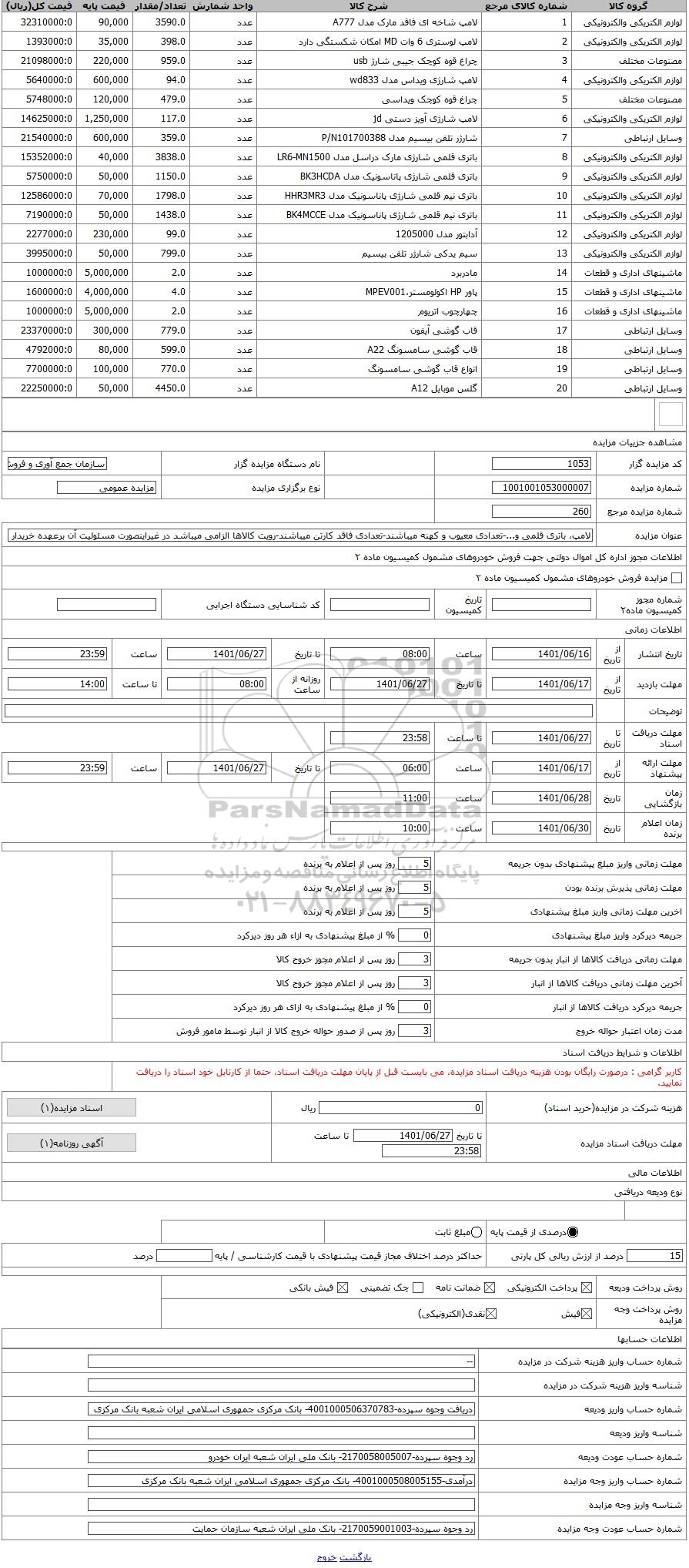 مزایده عمومی مزایده ، لامپ، باتری قلمی و...-تعدادی معیوب و کهنه میباشند-تعدادی فاقد کارتن میباشند-رویت کالاها الزامی میباشد در غیراینصورت مسئ برگزار میگردد. از کلیه افراد متخصص و شرکتهای واجد شرایط دعوت به عمل میآید تا در این مزایده با کد خبرگزاری پارس نماد : 4915460 شرکت نمایند تاریخ شروع مزایده : 1401/06/16 مهلت شرکت در مزایده: تا پایان روز 1401/06/27 مکان برگزاری اموال واگذاری استانهای قم و دستهبندیهای مربوط به این حراجی برق, منابع تغذیه, متفرقه میباشد.