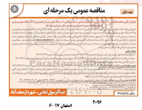 شهرداری نجف آباد درنظردارد فراخوان آگهی مناقصه بکارگیری 7 دستگاه خودرو شامل کاپرا دوکابین با مزدا دوکابین ، 6 دستگاه خودرو نیسان کمپرسی و 38 دستگاه خودرو سواری به همراه راننده به صورت استجاری و به صورت کلی شهرداری نجف آباد مطابق شرایط و مدارک موجود در اسناد مناقصه به شماره سیستمی 2001090286000008 را از طریق سامانه تدارکات الکترونیکی دولت برگزاری نماید