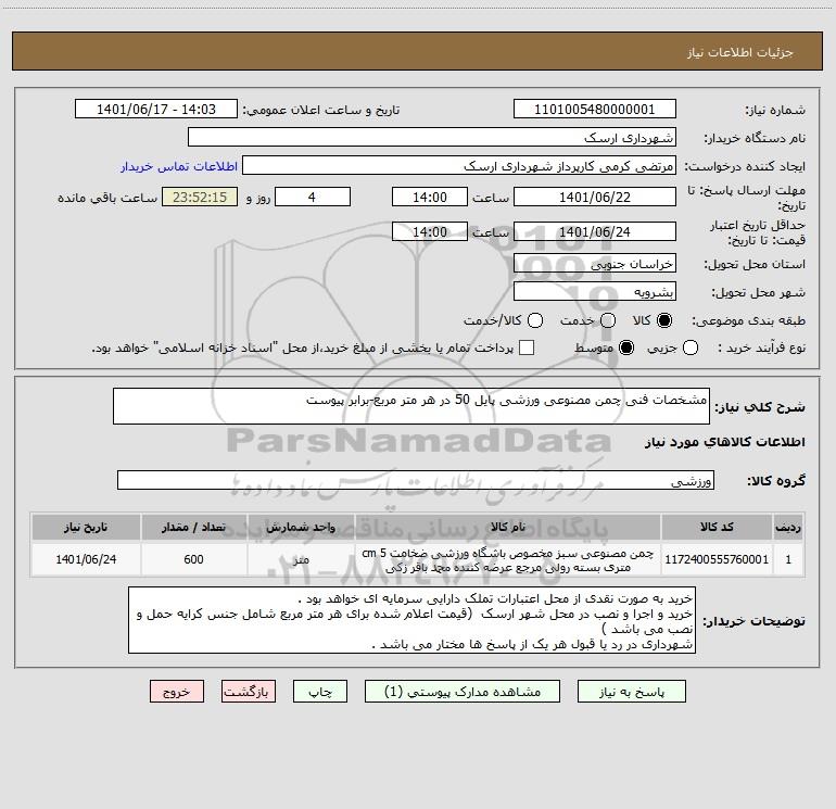 شرح کلی نیاز: مشخصات فنی چمن مصنوعی ورزشی پایل 50 در هر متر مربع-برابر پیوست