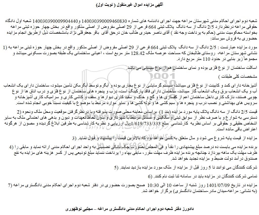 شعبه دوم اجرای احکام مدنی شهرستان مراغه جهت اجرای دادنامه های شماره 140030390009460830 و140030390009904440 شعبه اول دادگاه حقوقی مراغه درنظردارد 2/5 دانگ از سه دانگ  پلاک ثبتی 664 فرعی از 29 اصلی مفروض از اصلی مذکور واقع در بخش چهار حوزه ثبتی مراغه بخواسته محکومیت مدنی (حکم به پرداخت وجه نقد ) آقای ناصر حیدری طالب خان درحق آقای  باقر جعفرقلی نژاد بامشخصات ذیل ازطریق انجام مزایده حضوری به فروش میرساند: