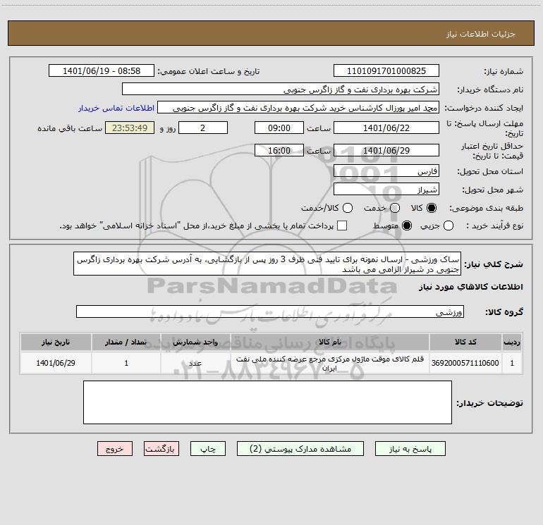 شرح کلی نیاز: ساک ورزشی - ارسال نمونه برای تایید فنی ظرف 3 روز پس از بازگشایی، به آدرس شرکت بهره برداری زاگرس جنوبی در شیراز الزامی می باشد