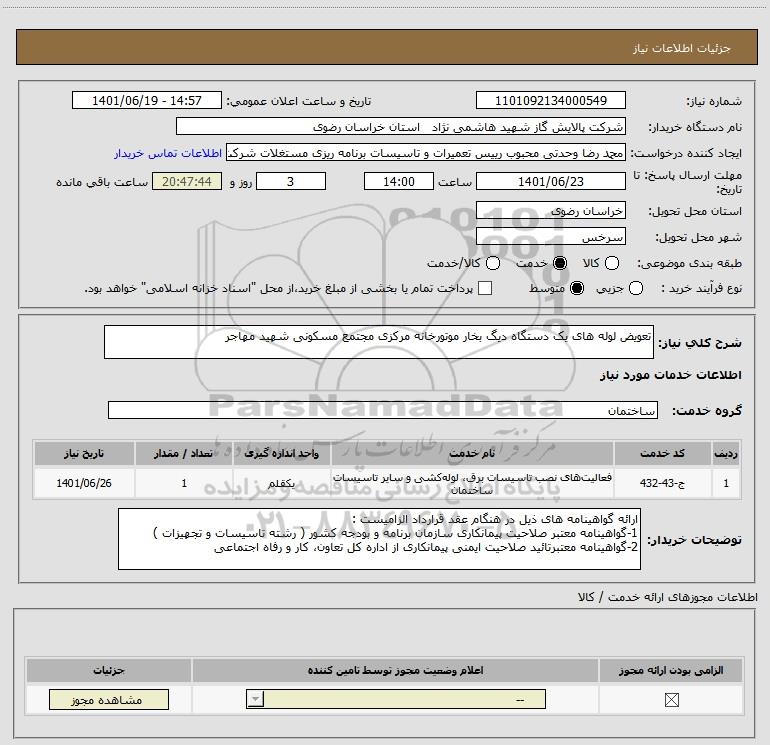 نام دستگاه خریدار:شرکت پالایش گاز شهید هاشمی نژاد استان خراسان رضوی