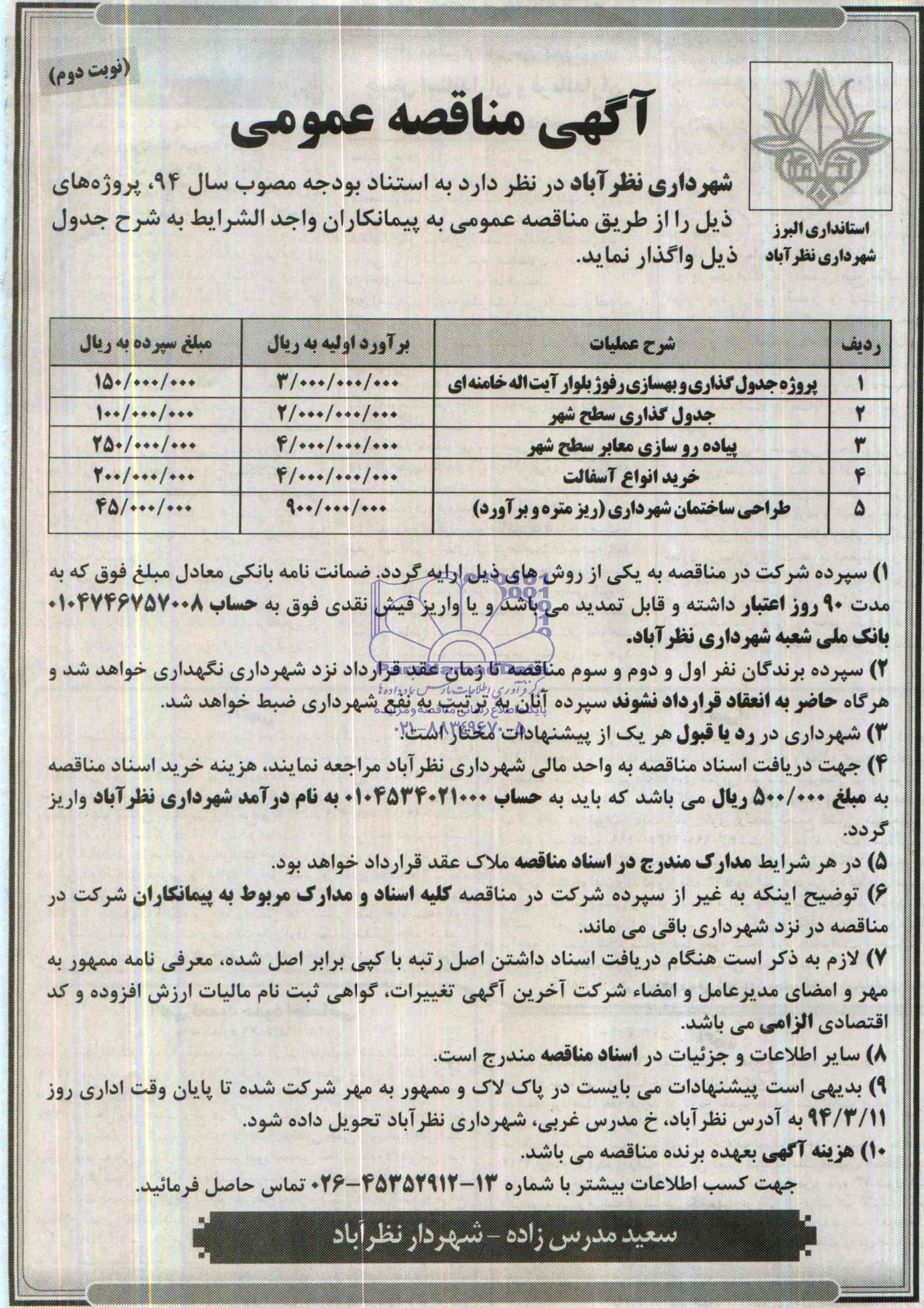 شهرداری نظرآباد در نظ ردارد به استناد بودجه مصوب سال 94، پروژه های ذیل را از طریق مناقصه عمومی به پیمانکاران واجدالشرایط به شرح جدول ذیل واگذار نماید.