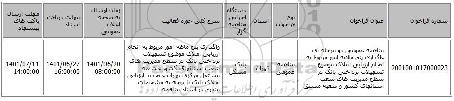 2001001017000023 | مناقصه عمومی دو مرحله ای واگذاری پنج ماهه امور مربوط به انجام ارزیابی املاک موضوع تسهیلات پرداختی بانک در سطح مدیریت های شعب استانهای کشور و شعبه مستق | مناقصه عمومی | تهران | بانک مسکن | واگذاری پنج ماهه امور مربوط به انجام ارزیابی املاک موضوع تسهیلات پرداختی بانک در سطح مدیریت های شعب استانهای کشور و شعبه مستقل مرکزی تهران و تجدید ارزیابی املاک بانک با توجه به مشخصات مندرج در اسناد مناقصه | 1401/06/20 08:00:00 | 1401/06/27 16:00:00 | 1401/07/11 14:00:00 |
