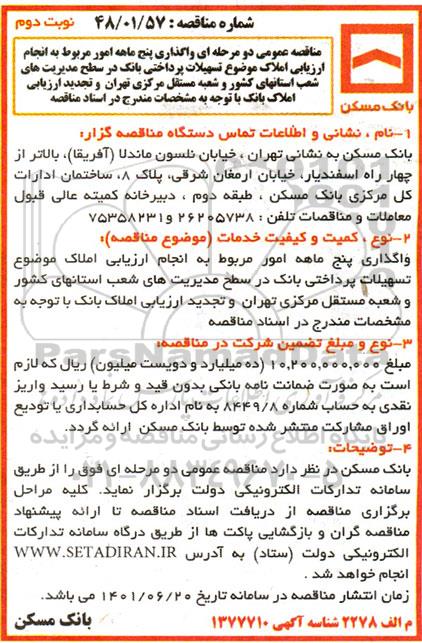 واگذاری پنج ماهه امور مربوط به انجام ارزیابی املاک موضوع تسهیلات پرداختی بانک در سطح مدیریت های شعب استان های کشور و شعبه مستقل مرکزی تهران و تجدید ارزیابی املاک بانک  با توجه به مشخصات مندرج در اسناد مناقصه