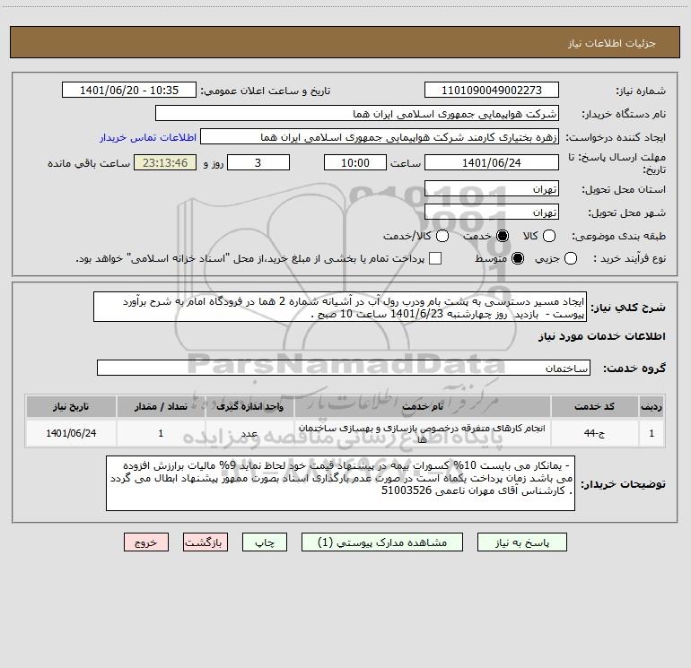 شرح کلی نیاز: ایجاد مسیر دسترسی به پشت بام ودرب رول آب در آشیانه شماره 2 هما در فرودگاه امام به شرح برآورد پیوست - بازدید روز چهارشنبه 1401/6/23 ساعت 10 صبح .