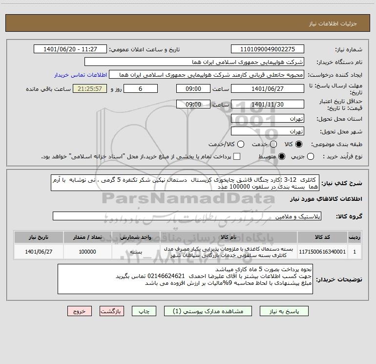 شرح کلی نیاز: کاتلری 12-3 :کارد چنگال قاشق چایخوری کریستال دستمال نپکین شکر تکنفره 5 گرمی ، نی نوشابه با آرم هما بسته بندی در سلفون 100000 عدد