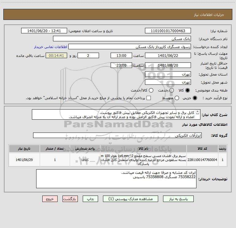 شرح کلی نیاز: کابل برق و سایر تجهیزات الکتریکی مطابق پیش فاکتور پیوست. امضاء و ارائه نمودن پیش فاکتور الزامی بوده و عدم ارائه آن به منزله انصراف میباشد.