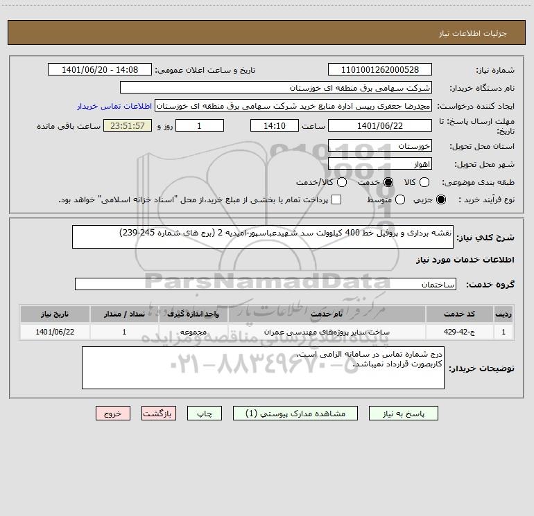 شرح کلی نیاز: نقشه برداری و پروفیل خط 400 کیلوولت سد شهیدعباسپور-امیدیه 2 (برج های شماره 245-239)