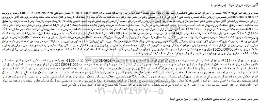 مزایده فروش ملک بشماره پلاک ثبتی 47 فرعی از114- اصلی , مزایده فروش ملک بشماره پلاک ثبتی 47 فرعی از114- اصلی