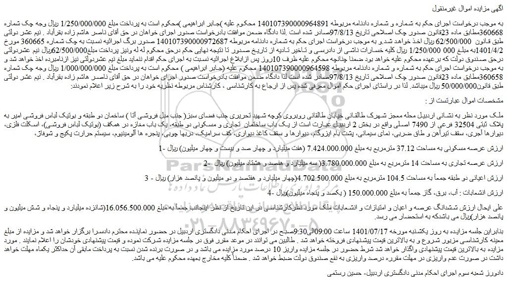 به موجب درخواست اجرای حکم به شماره و شماره دادنامه مربوطه 140107390000964891 محکوم علیه )جابر ابراهیمی )محکوم است به پرداخت مبلغ 1/250/000/000 ریال وجه چک شماره 360668مطابق ماده 23قانون صدور چک اصلاحی تاریخ 97/8/13صادر شده است .لذا دادگاه ضمن موافقت بادرخواست صدور اجرای خواهان در حق آقای ناصر هاشم زاده بقرآباد . نیم عشر دولتی طبق قانون 62/500/000 ریال اخذ خواهد شد.و به موجب درخواست اجرای حکم به شماره دادنامه مربوطه 140107390000972687 صدور برگ اجرائیه نسبت به چک شماره 360665 مورخ 1401/4/2به مبلغ 000 1/250/000 ریال کلیه خسارات ناشی از دادرسی و تاخیر تادیه از تاریخ صدور تا نتیجه نهایی حکم درحق محکوم له له ونیز پرداخت مبلغ62/500/000ریال نیم عشردولتی درحق صندوق دولت که برعهده محکوم علیه خواهد بود ضمنا چنانچه محکوم علیه ظرف 10روز پس ازابلاغ اجرائیه نسبت به اجرای حکم اقدام ننماید مبلغ نیم عشردولتی نیز ازنامبرده اخذ خواهد شد و به موجب درخواست اجرای حکم به شماره و شماره دادنامه مربوطه 140107390000964598 محکوم علیه (جابر ابراهیمی ) محکوم است به پرداخت مبلغ 1/000/000/000 ریال وجه چک شماره 360658مطابق ماده 23قانون صدور چک اصلاحی تاریخ 97/8/13صادر شده است لذا دادگاه ضمن موافقت بادرخواست صدور اجرای خواهان در حق آقای ناصر هاشم زاده بقرآباد . نیم عشر دولتی طبق قانون50/000/000 ریال میباشد. لذا در راستای اجرای حکم اموال معرفی شده پس از ارجاع به کارشناسی ، کارشناس مربوطه نظریه خود را به شرح زیر اعلام نمودند: