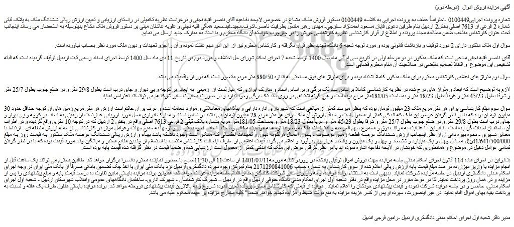 شماره پرونده اجرایی0100449 -احتراماً عطف به پرونده اجرایی به کلاسه 0100449 دستور فروش ملک مشاع در خصوص لایحه دفاعیه آقای ناصر فقیه نجفی و درخواست نظریه تکمیلی در راستای ارزیابی و تعیین ارزش ریالی ششدانگ ملک به پلاک ثبتی شماره 2 فرعی از 7613 اصلی بخش2 اردبیل بنام طرفین دعوی قایان مسعود احمدنژاد سقزچی- مهدی رهبر مقدس بطرفیت ناصر-اشرف-مجید-محمد-سعید همگی فقیه نجفی و علویه عاشقان مبنی بر دستور فروش ملک مشاع بدینوسیله به استحضار می رساند اینجانب تحت عنوان کارشناس منتخب ضمن مطالعه مجدد پرونده و اطلاع از قرار کارشناسی نظریه کارشناسی خویش را در چارچوب خواسته آن دادگاه محترم و با اسناد به مدارک جدید ارسال می نمایم.