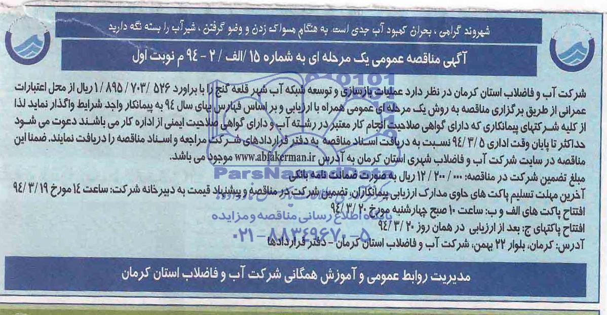 شرکت آب و فاضلاب استان کرمان درنظردارد عملیات بازسازی و توسعه شبکه آب شهر قلعه گنج را با برآورد 1.895.703.526 ریال از محل اعتبارات عمرانی از طریق برگزاری مناقصه به روش یک مرحله ای عمومی همراه با ارزیابی و بر اساس فهارس بهای سال 94 به پیمانکار واجد شرایط واگذار نماید لذا از کلیه شرکتهای پیمانکاری که دارای گواهی صلاحیت انجام کار معتبر در رشته آب و دارای گواهی صلاحیت ایمنی از اداره کال می باشند دعوت میشود حداکثر تا پایان وقت اداری 94.3.5 نسبت به دریافت اسناد مناقصه به دفتر قراردادهای شرکت مراجعه و اسناد مناقصه را دریافت نمایند. ضمنا این مناقصه در سایت شرکت اب و فاضلاب شهری استان کرمان به آدرس WWW.ABFAKERMAN.IR موجود می باشد.