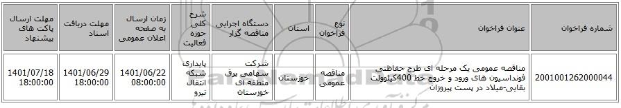 | 2001001262000044 | مناقصه عمومی یک مرحله ای طرح حفاظتی فونداسیون های ورود و خروج خط 400کیلوولت بقایی-میلاد در پست پیروزان | مناقصه عمومی | خوزستان | شرکت سهامی برق منطقه ای خوزستان | پایداری شبکه انتقال نیرو | 1401/06/22 08:00:00 | 1401/06/29 18:00:00 | 1401/07/18 18:00:00 |