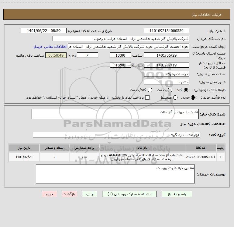 نام دستگاه خریدار:شرکت پالایش گاز شهید هاشمی نژاد استان خراسان رضوی