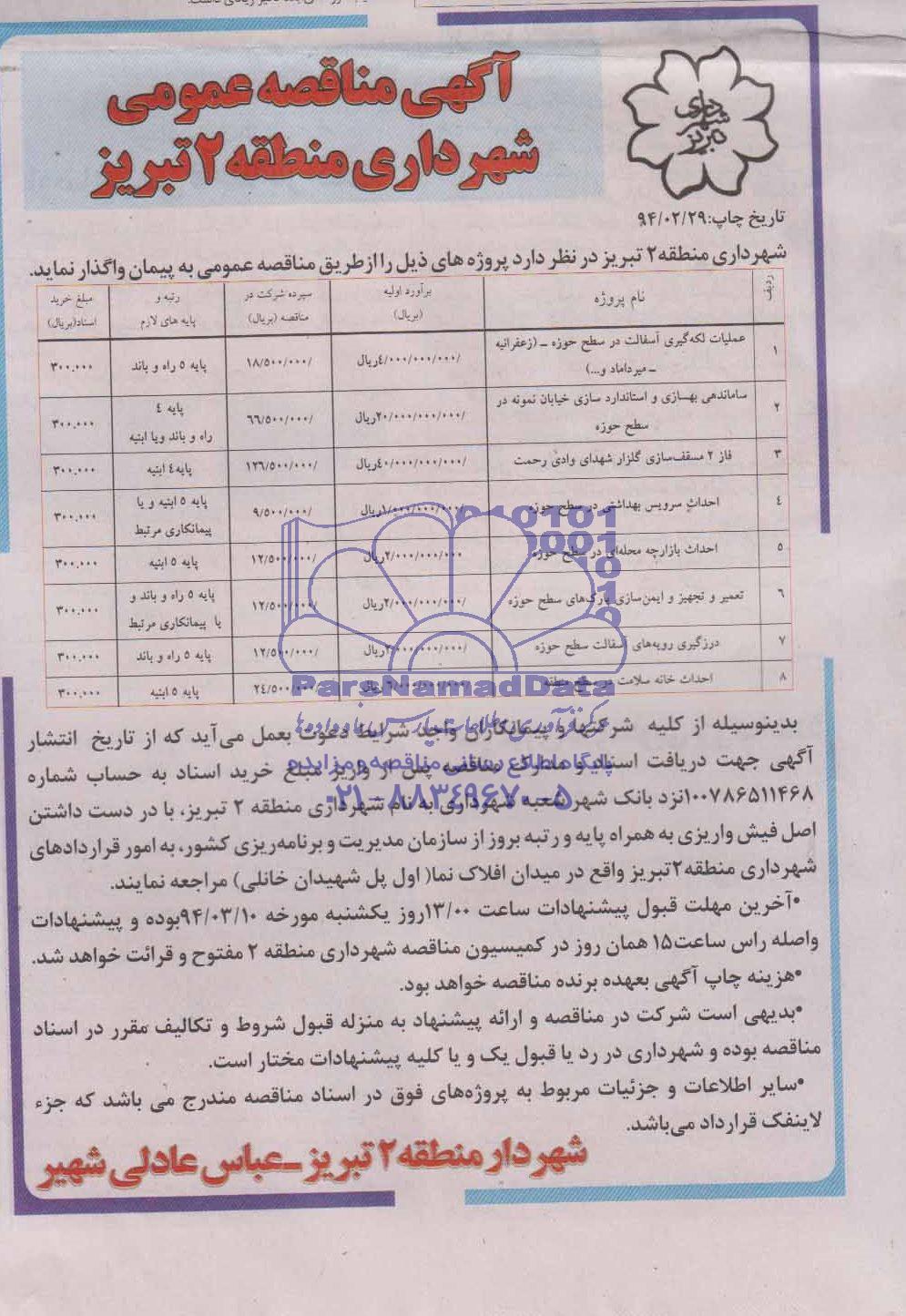 شهرداری منطقه 2 تبریز در نظر دارد پروژه های ذیل را از طریق مناقصه عمومی به پیمان واگذار نماید