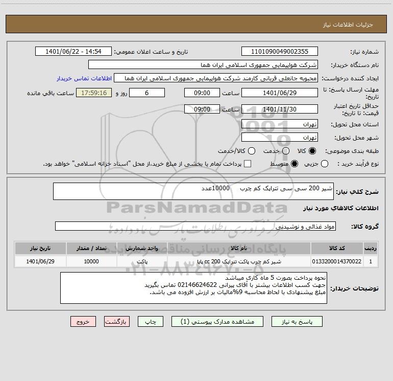 شرح کلی نیاز: شیر 200 سی سی تتراپک کم چرب 10000عدد