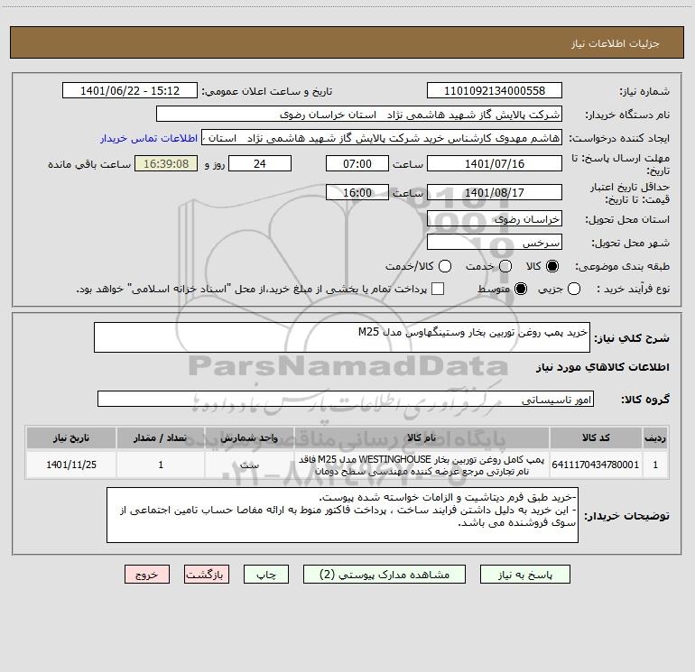شرح کلی نیاز: خرید پمپ روغن توربین بخار وستینگهاوس مدل M25