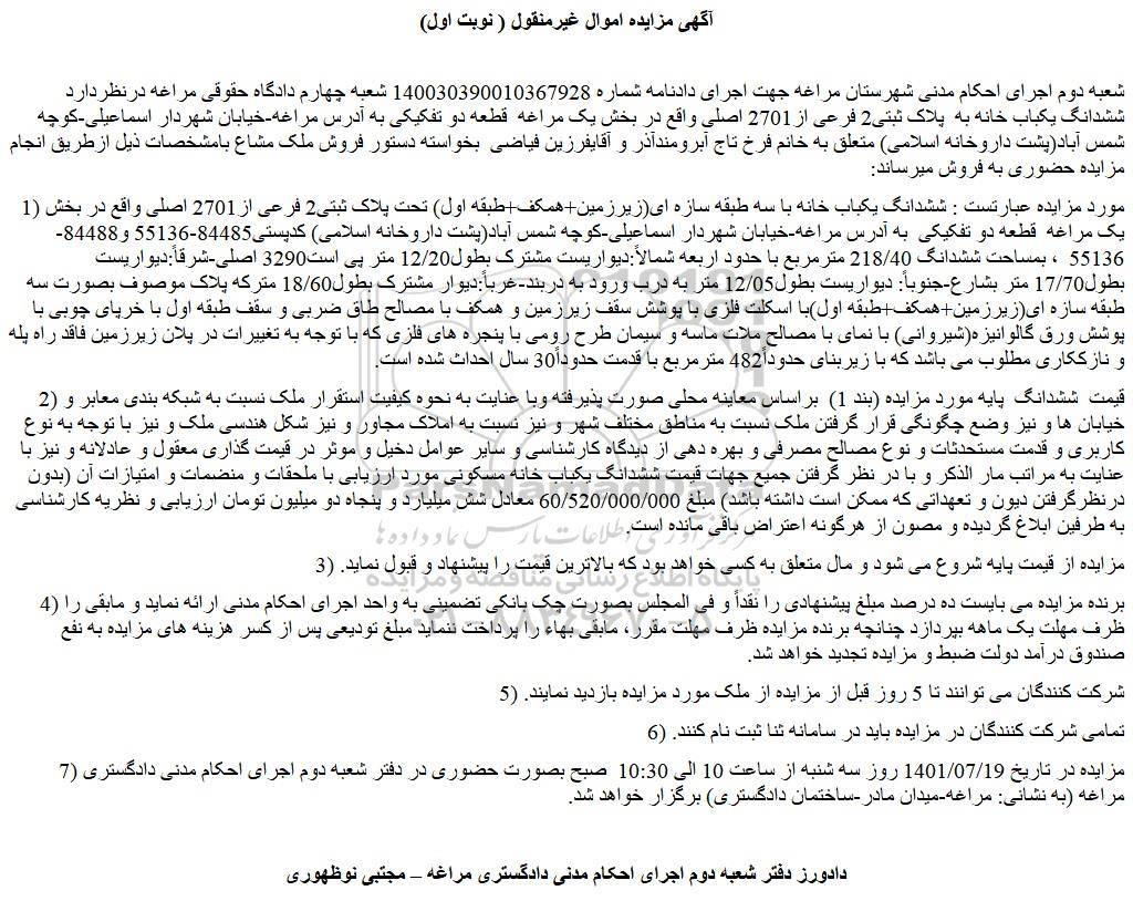 شعبه دوم اجرای احکام مدنی شهرستان مراغه جهت اجرای دادنامه شماره 140030390010367928 شعبه چهارم دادگاه حقوقی مراغه درنظردارد ششدانگ یکباب خانه به پلاک ثبتی2 فرعی از2701 اصلی واقع در بخش یک مراغه قطعه دو تفکیکی به آدرس مراغه-خیابان شهردار اسماعیلی-کوچه شمس آباد(پشت داروخانه اسلامی) متعلق به خانم فرخ تاج آبرومندآذر و آقایفرزین فیاضی بخواسته دستور فروش ملک مشاع بامشخصات ذیل ازطریق انجام مزایده حضوری به فروش میرساند: