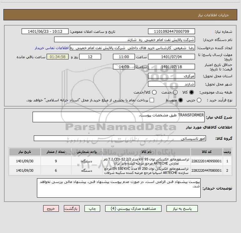 شرح کلی نیاز: TRANSFORMER طبق مشخصات پیوست.