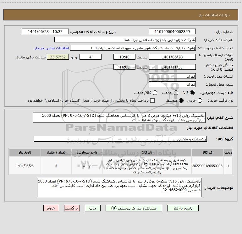 شرح کلی نیاز: پلاستیک رولی 15% میکرون عرض 3 متر با کارشناس هماهنگ شود (PN: 970-16-7-STD) تعداد 5000 کیلوگرم می باشد ایران کد جهت تشابه است