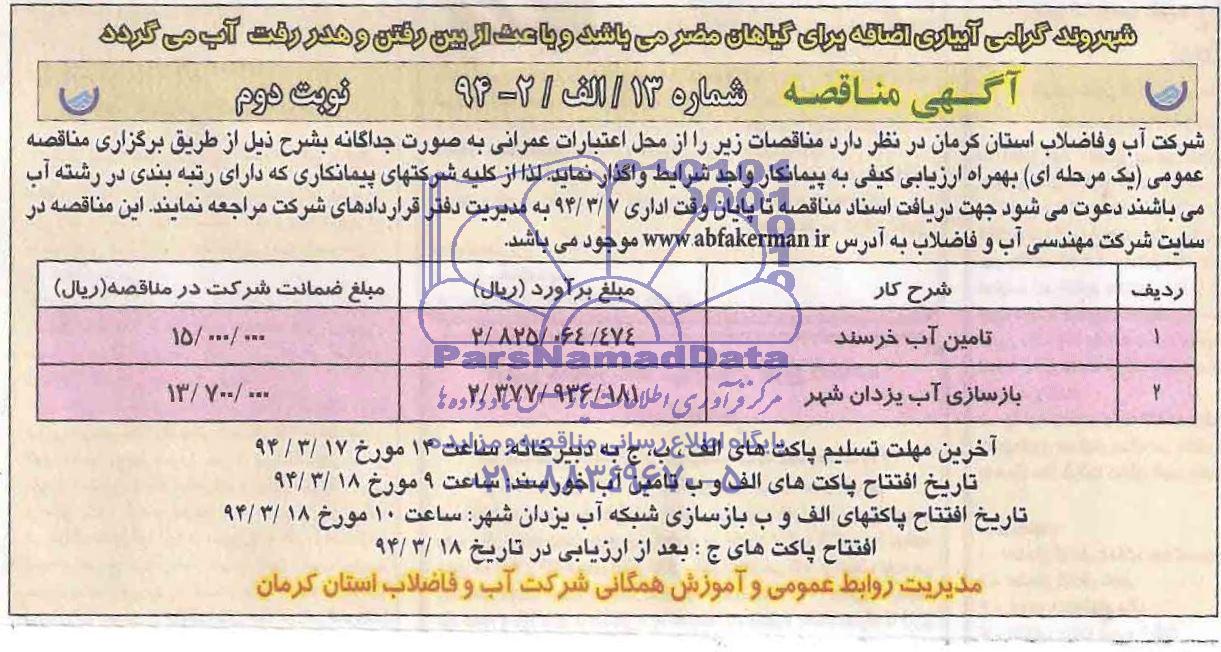 افتتاح پاکتهای الف و ب تامین آب خورسند ساعت 9 مورخ 94.3.18