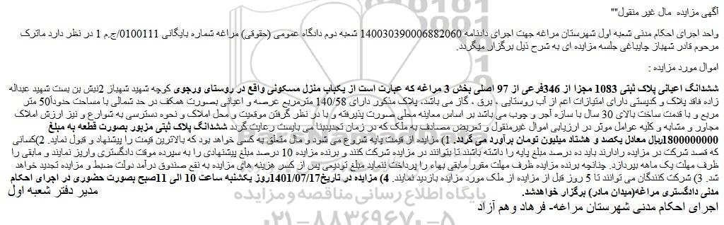 ششدانگ اعیانی پلاک ثبتی 1083 مجزا از 346فرعی از 97 اصلی بخش 3 مراغه که عبارت است از یکباب منزل مسکونی واقع در روستای ورجوی کوچه شهید شهباز 2نبش بن بست شهید عبداله زاده فاقد پلاک و کدپستی دارای امتیازات اعم از آب روستایی ، برق ، گاز می باشد، پلاک مذکور دارای 140/58 مترمربع عرصه و اعیانی بصورت همکف در حد شمالی با مساحت حدوداَ50 متر مربع و با قدمت ساخت بالای 30 سال با سازه آجر و چوب می باشد بر اساس معاینه محلی صورت پذیرفته و با در نظر گرفتن موقعیت و محل املاک و نحوه دسترسی به شوارع و نیز ارزش املاک مجاور و مشابه و کلیه عوامل موثر در ارزیابی اموال غیرمنقول و تعریض مصادف به ملک که در زمان تجدیدبنا می بایست رعایت گردد ششدانگ پلاک ثبتی مزبور بصورت قطعه به مبلغ 1800000000ریال معادل یکصد و هشتاد میلیون تومان برآورد می گردد. 1) مزایده از قیمت پایه شروع می شود و مال متعلق به کسی خواهد بود که بالاترین قیمت را پیشنهاد و قبول نماید. 2)کسانی که قصد شرکت در مزایده رادارند باید ده درصد مبلغ پایه را داشته باشند تا بتوانند در مزایده شرکت کنند و برنده مزایده 10 درصد مبلغ پیشنهادی را به سپرده موقت دادگستری واریز نمایند و مابقی را ظرف مهلت یک ماهه بپردازد. چنانچه برنده مزایده ظرف مهلت مقرر مابقی بهاء را پرداخت ننماید مبلغ تودیعی پس از کسر هزینه های مزایده به نفع صندوق درآمد دولت ضبط و مزایده تجدید خواهد شد. 3) شرکت کنندگان می توانند تا 5 روز قبل از مزایده از ملک مورد مزایده بازدید نمایند. 4) مزایده در تاریخ1401/07/17روز یکشنبه ساعت 10 الی 11صبح بصورت حضوری در اجرای احکام مدنی دادگستری مراغه(میدان مادر) برگزار خواهدشد. مدیر دفتر شعبه اول اجرای احکام مدنی شهرستان مراغه- فرهاد وهم آزاد