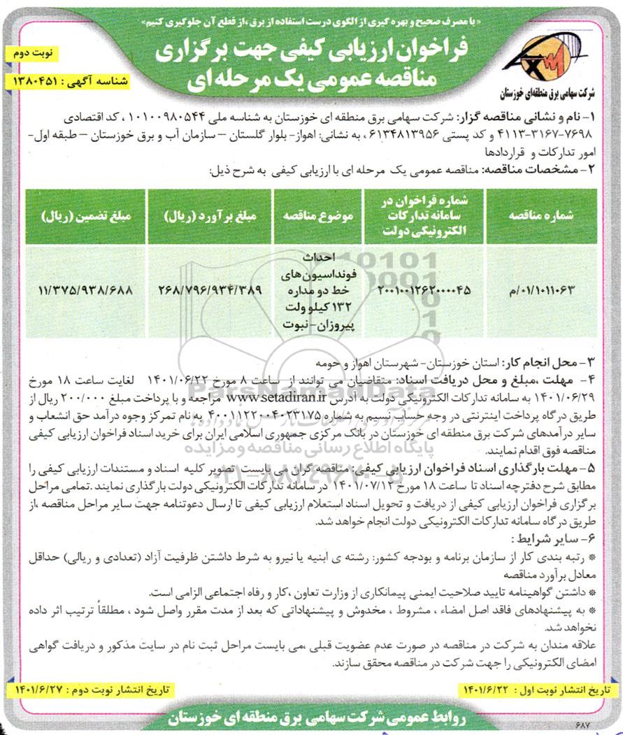 | 1011063/ 01 / م | 2001001262000045 | احداث فوندانسیون های خط دو مداره 132 کیلوولت پیروزان- نبوت | 268.796.934.389 | 11.375.938.688 |