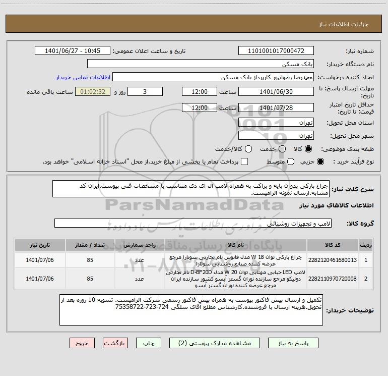استعلام بها و موضوع استعلام استعلام چراغ پارکی بدو ن پایه و براکت به همراه لامپ ال ای دی متناسب با مشخصات فنی پیوست.ایران کد مشابه.ارسال نمونه الزامیست. به اطلاع کلیه شرکتها و افراد متخصص واجد شرایط میرساند، آگهی گذار در نظر دارد از طریق استعلام بها، نسبت به انتخاب و دریافت پیشنهادات اقدام نماید. این استعلام با کد آگهی ثبت شده در سامانه خبرگزاری پارس نماد : 4944680 منتشر شده است. مشخصات استعلام : تاریخ شروع استعلام: 1401/06/27 آخرین مهلت ارسال پیشنهاد قیمت : 1401/06/30 و محل اجرای پروژه : استان تهران میباشد. استعلام قیمت مورد درخواست : استعلام چراغ پارکی بدو ن پایه و براکت به همراه لامپ ال ای دی متناسب با مشخصات فنی پیوست.ایران کد مشابه.ارسال نمونه الزامیست. با دستهبندیهای تخصصی و گروه های مرتبط : صنایع روشنایی, تجهیزات پارک و مبلمان شهری, تجهیزات برق و الکترونیک, استعلام اطلاع رسانی میگردد. شرایط شرکت در استعلام آنلاین : ابتدا ثبت نام در سامانه استعلام پارس نماد و تکمیل مدارک موردنیاز و بارگذاری در سامانه رعایت تمامی ضوابط و الزامات مندرج در اسناد استعلام است.