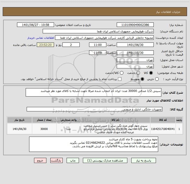 شرح کلی نیاز: سینی 1/2 صدفی 30000 عدد- ایران کد انتخاب شده صرفا جهت تشابه با کالای مورد نظر میباشد