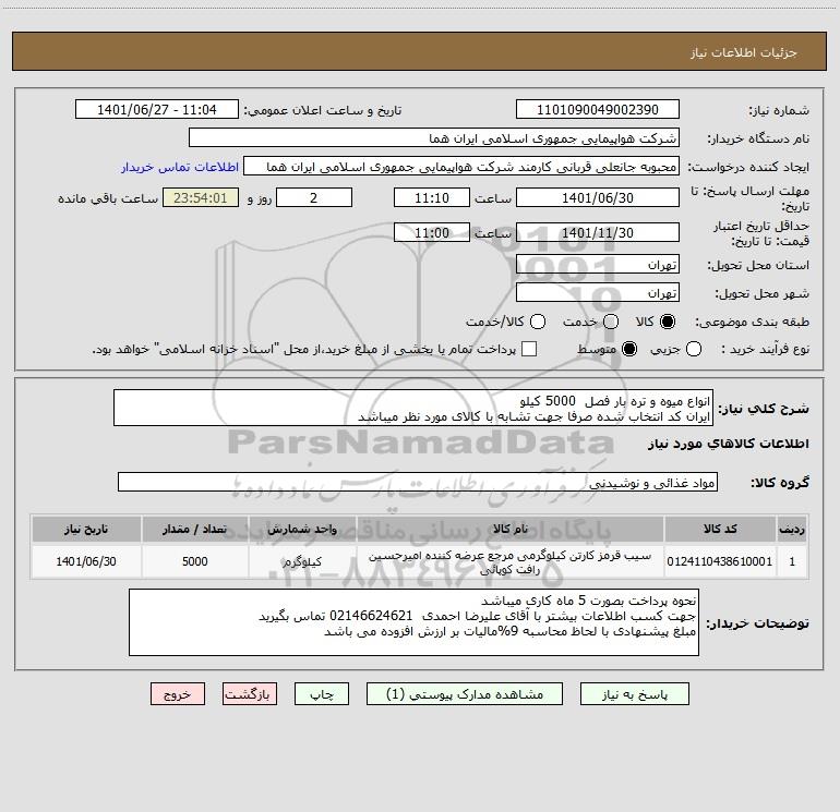 شرح کلی نیاز: انواع میوه و تره بار فصل 5000 کیلو