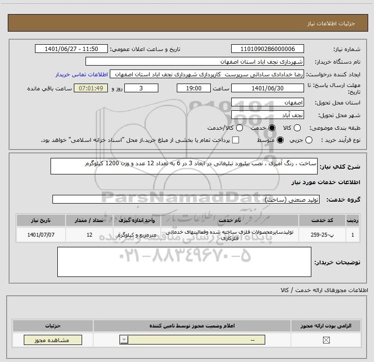 شرح کلی نیاز: ساخت ، رنگ آمیزی ، نصب بیلبورد تبلیغاتی در ابعاد 3 در 6 به تعداد 12 عدد و وزن 1200 کیلوگرم