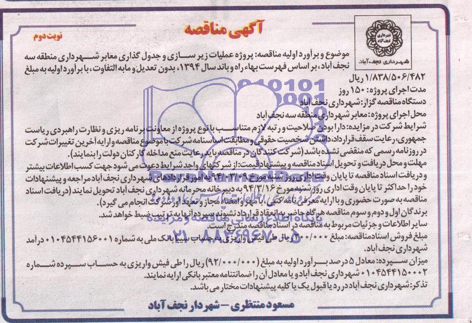 موضوع و برآورد اولیه مناقصه: پروژه عملیات زیرسازی و جدول گذاری معابر شهرداری منطقه سه نجف آباد، براساس فهرست بهاء راه و باند سال 1394، بدون تعدیل و مابه التفاوت، با برآورد اولیه به مبلغ 1.838.506.482 ریال