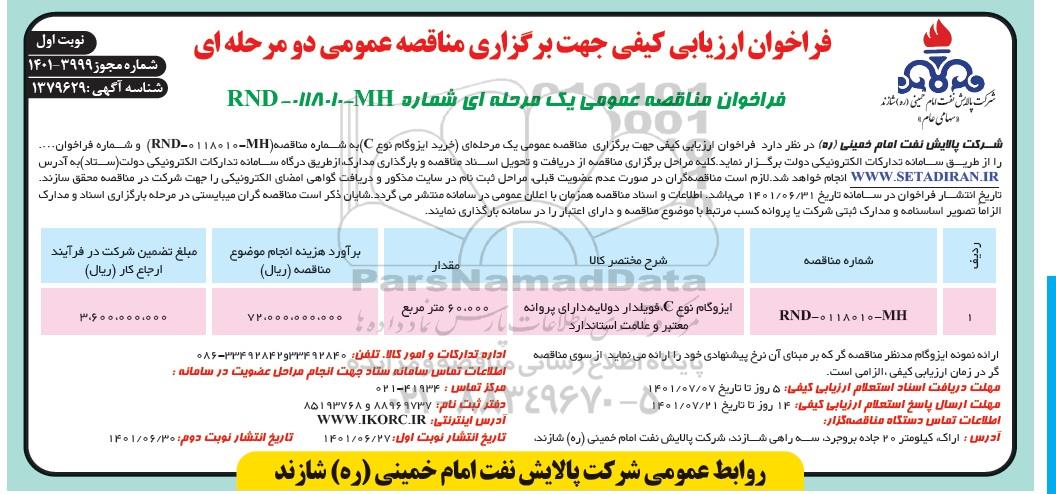 شرکت پالایش نفت امام خمینی (ره) شازند در نظر دارد فراخوان ارزیابی کیفی جهت برگزاری مناقصه عمومی دو مرحله ای (خرید ایزوگام نوع c) به شماره مناقصه RND-0118010-MH و شماره فراخوان... را از طریق سامانه تدارکات الکترونیکی دولت برگزار نماید. کلیه مراحل برگزاری فراخوان ارزیابی کیفی از دریافت و تحویل اسناد استعلام ارزیابی کیفی تا ارسال دعوتنامه جهت سایر مراحل مناقصه از طریق درگاه سامانه تدارکات الکترونیکی دولت ستاد به آدرس ستاد ایران انجام خواهد شد . لازم است مناقصه گران در صورت عدم عضویت قبلی مراحل ثبت نام در سایت مذکور و دریافت گواهی امضای الکترونیکی را جهت شرکت در مناقصه محقق سازند. تاریخ انتشار فراخوان در سامانه تاریخ 1401.6.31 می باشد. اطلاعات و اسناد مناقصه همزمان با اعلان عمومی در سامانه منتشر می گردد. شایان ذکر است مناقصه گران می بایستی در مرحله بارگزاری اسناد و مدارک الزاما تصویر اساسنامه و مدارک ثبتی شرکت یا پروانه مرتبط با موضوع مناقصه و دارای اعتبار در سامانه بارگزاری نمایند.