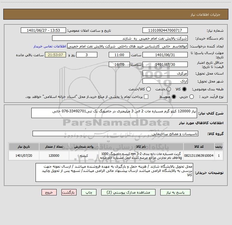 شرح کلی نیاز: نیاز 120000 کیلو گرم مسباره مات 2 الی 3 میلیمتری در جامبوبگ یک تنی33492701-076 خانی