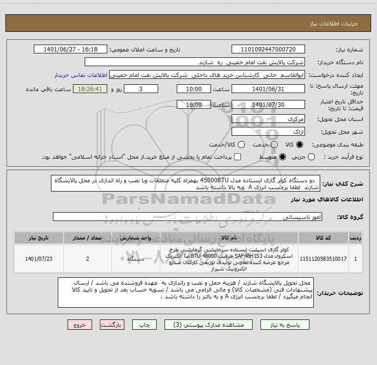 شرح کلی نیاز: دو دستگاه کولر گازی ایستاده مدل 45000BTU بهمراه کلیه متعلقات وبا نصب و راه اندازی در محل پالایشگاه شازند لطفا برچسب انرژی A وبه بالا داشته باشد