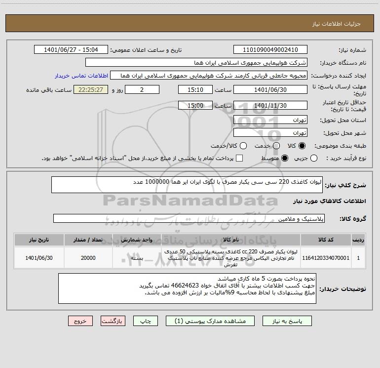 شرح کلی نیاز: لیوان کاغذی 220 سی سی یکبار مصرف با لگوی ایران ایر هما 1000000 عدد