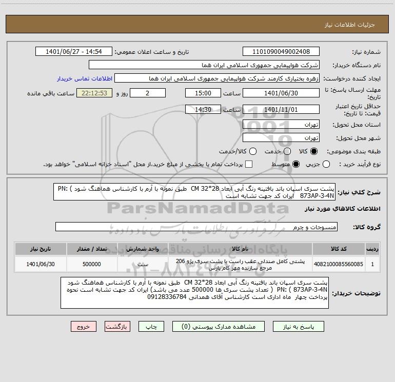 شرح کلی نیاز: پشت سری اسپان باند بافتینه رنگ آبی ابعاد 28*32 CM طبق نمونه با آرم با کارشناس هماهنگ شود PN: ( 873AP-3-4N ایران کد جهت تشابه است