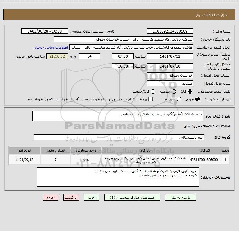 نام دستگاه خریدار:شرکت پالایش گاز شهید هاشمی نژاد استان خراسان رضوی