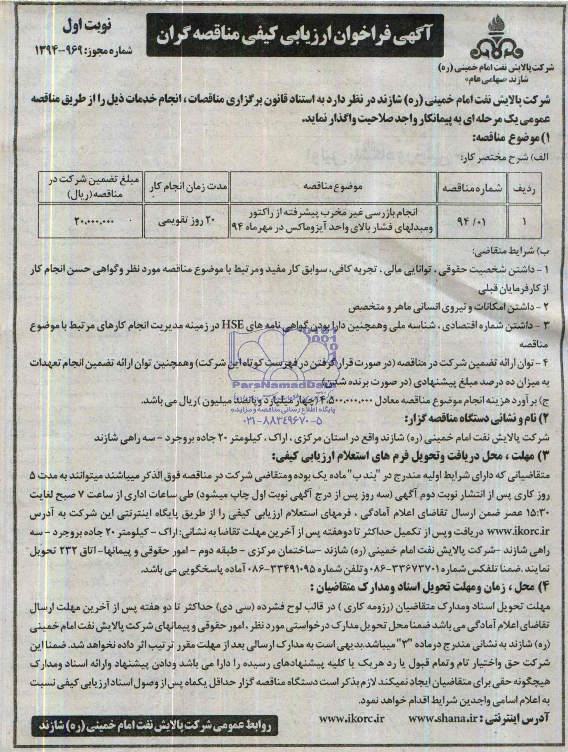 موضوع مناقصه : انجام بازرسی غیرمخرب پیشرفته از راکتور و مبدلهای فشار بالای واحد آیزوماکس در مهرماه 94