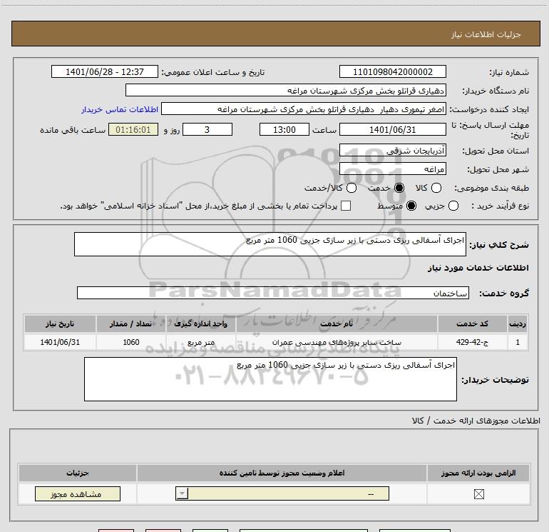 شرح کلی نیاز: اجرای آسفالی ریزی دستی با زیر سازی جزیی 1060 متر مربع