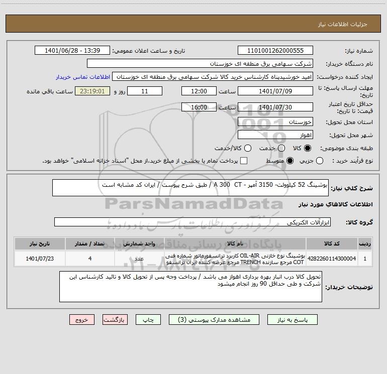 شرح کلی نیاز: بوشینگ 52 کیلوولت- 3150 آمپر - A 300 CT / طبق شرح پیوست / ایران کد مشابه است