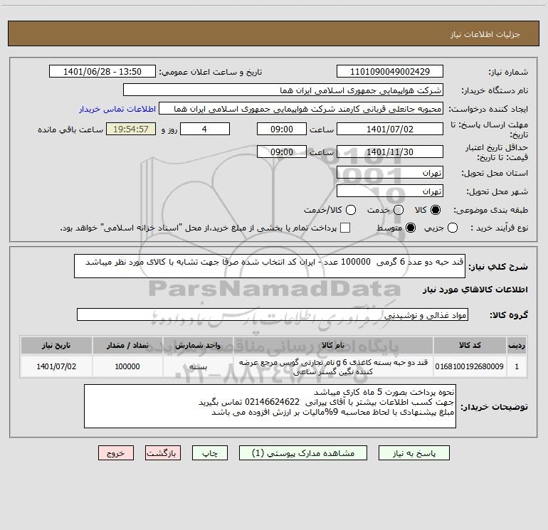 شرح کلی نیاز: قند حبه دو عدد 6 گرمی 100000 عدد - ایران کد انتخاب شده صرفا جهت تشابه با کالای مورد نظر میباشد