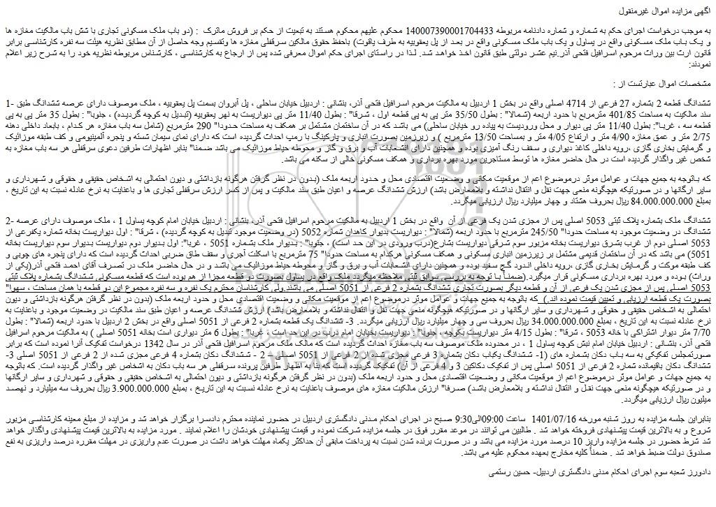 2- ششدانگ ملک بشماره پلاک ثبتی 5053 اصلی پس از مجزی شدن یک فرعی از آن  واقع در بخش 1 اردبیل به مالکیت مرحوم اسرافیل فتحی آذر، بنشانی : اردبیل خیابان امام کوچه یساول 1 ، ملک موصوف دارای عرصه ششدانگ در وضعیت موجود به مساحت حدودا" 245/50 مترمربع با حدود اربعه (شمالا" : دیواریست بدیوار کاهدان شماره 5052 (در وضعیت موجود تبدیل به کوچه گردیده) ، شرقا" : اول دیواریست بخانه شماره یکفرعی از 5053 اصلی دوم از غرب بشرق دیواریست بخانه مزبور سوم شرقی دیواریست بشارع(درب ورودی در این حد است) ، جنوبا" : بدیوار ملک بشماره 5051 ، غربا": اول بدیوار دوم دیواریست بدیوار سوم دیواریست بخانه 5051) می باشد که در آن ساختمان قدیمی مشتمل بر زیرزمین انباری مسکونی و همکف مسکونی هرکدام به مساحت حدودا" 75 مترمربع با اسکلت آجری و سقف طاق ضربی احداث گردیده است که دارای پنجره های چوبی و کف طبقه موکت و گرمایش بخاری گازی ،رویه داخلی اندود گچ سفید بوده و همچنین دارای انشعابات آب و برق و گاز و محوطه حیاط موزائیک می باشد و در حال حاضر ملک در تصرف آقای احمد فتحی آذر(یکی از وراث) بوده و مورد بهره برداری مسکونی قرار میگیرد.(ضمناً با توجه به بررسی سوابق ثبتی ملاحظه میگردد ملک واقع در یساول بصورت دو قطعه مجزا از هم بوده است که قطعه مسکونی ششدانگ بشماره پلاک ثبتی 5053 اصلی پس از مجزی شدن یک فرعی از آن و قطعه دیگر بصورت تجاری ششدانگ بشماره 2 فرعی از 5051 اصلی می باشند.ولی کارشناسان محترم یک نفره و سه نفره مجموع این دو قطعه با همان مساحت ، سهوا" بصورت یک قطعه ارزیابی و تعیین قیمت نموده اند.)  که باتوجه به جمیع جهات و عوامل موثر درموضوع اعم از موقعیت مکانی و وضعیت اقتصادی محل و حدود اربعه ملک (بدون در نظر گرفتن هرگونه بازداشتی و دیون احتمالی به اشخاص حقیقی و حقوقی و شهرداری و سایر ارگانها و در صورتیکه هیچگونه منعی جهت نقل و انتقال نداشته و بلامعارض باشد) ارزش ششدانگ عرصه و اعیان طبق سند مالکیت در وضعیت موجود و باعنایت به نرخ عادله نسبت به این تاریخ ، بمبلغ 34.000.000.000 ریال بحروف سی و چهار میلیارد ریال ارزیابی میگردد. 3- ششدانگ یک قطعه بشماره 2 فرعی از 5051 اصلی واقع در بخش 2 اردبیل با حدود اربعه (شمالا" : بطول 7/70 متر دیوار اشتراکی با خانه 5053 ، شرقا" : بطول 4/15 متر دیواریست بکوچه ، جنوبا" : دیواریست بخیابان امام درب در این حد است ، غربا" : بطول 6 متر دیواری است بخانه 5051 اصلی ) به مالکیت مرحوم اسرافیل فتحی آذر، بنشانی : اردبیل خیابان امام نبش کوچه یساول 1 ، در محدوده ملک موصوف سه باب مغازه احداث گردیده است که مالک ملک مرحوم اسرافیل فتحی آذر در سال 1342 درخواست تفکیک آنرا نموده است که برابر صورتمجلس تفکیکی به سه باب دکان بشماره های (1- ششدانگ یکباب دکان بشماره 3 فرعی مجزی شده از 2 فرعی از 5051 اصلی – 2 - ششدانگ دکان بشماره 4 فرعی مجزی شده از 2 فرعی از 5051 اصلی 3- ششدانگ دکان باقیمانده شماره 2 فرعی از 5051 اصلی پس از تفکیک دکاکین 3 و 4 فرعی از آن) تفکیک گردیده است که بنا به اظهار طرفین پرونده سرقفلی هر سه باب دکان به اشخاص غیر واگذار گردیده است. که باتوجه به جمیع جهات و عوامل موثر درموضوع اعم از موقعیت مکانی و وضعیت اقتصادی محل و حدود اربعه ملک (بدون در نظر گرفتن هرگونه بازداشتی و دیون احتمالی به اشخاص حقیقی و حقوقی و شهرداری و سایر ارگانها و در صورتیکه هیچگونه منعی جهت نقل و انتقال نداشته و بلامعارض باشد) صرفا" ارزش مالکیت مغازه های موصوف باعنایت به نرخ عادله نسبت به این تاریخ ، بمبلغ 3.900.000.000 ریال بحروف سه میلیارد و نهصد میلیون ریال ارزیابی میگردد.