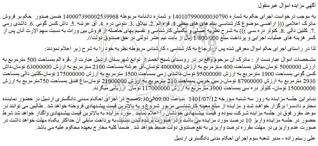 به موجب درخواست اجرای حکم به شماره 140107990000030790 و شماره دادنامه مربوطه 140007390002539968 ضمن صدور حکم بر فروش ماترک اعلامی ((( اراضی موضوع کارشناسی بنام های های محلی 1. قره الم .2. ییلاق .3. نئوتی دره .4. آق عرشه .5. داش کسن گونی .6. داشدی زمی .7. کلئین دالی .8. کئولر دره سی ))) به شرح نظریه اصلی و تکمیلی کارشناسی و تقسیم بهای حاصله از فروش بین وراث به نسبت سهم الارث آنان پس از کسر هزینه های عملیات اجرایی و پرداخت مبلغ 1/800/000 ریال از بابت نیم عشر دولتی در حق صندوق دولت//.
