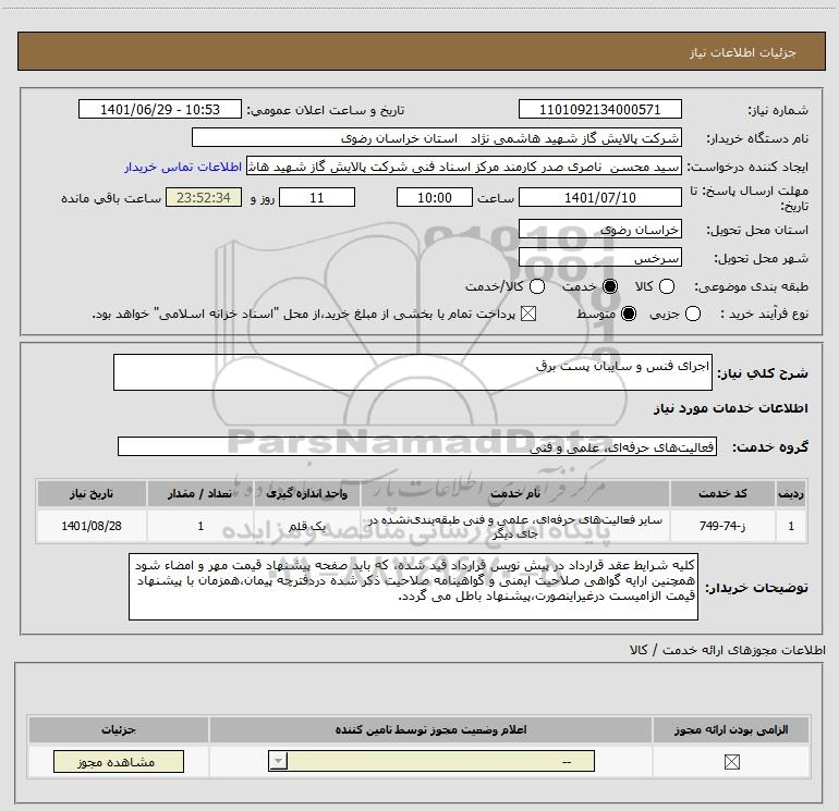 نام دستگاه خریدار:شرکت پالایش گاز شهید هاشمی نژاد استان خراسان رضوی