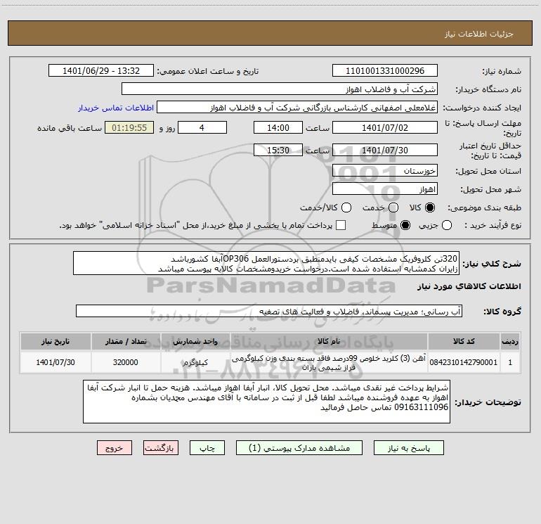 شرح کلی نیاز: 320تن کلروفریک مشخصات کیفی بایدمنطبق بردستورالعمل OP306آبفا کشورباشد