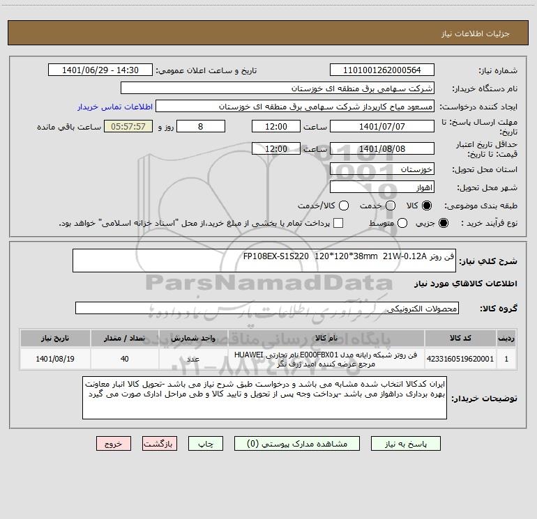 | 1 | 4233160519620001 | فن روتر شبکه رایانه مدل E000FBX01 نام تجارتی HUAWEI مرجع عرضه کننده امید ژرف نگر | عدد | 40 | 1401/08/19 |