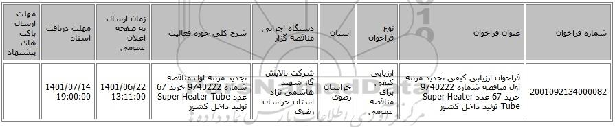 مناقصه، فراخوان ارزیابی کیفی تجدید مرتبه اول مناقصه شماره 9740222 خرید 67 عدد Super Heater Tube تولید داخل کشور, مناقصه، فراخوان ارزیابی کیفی تجدید مرتبه اول مناقصه شماره 9740222 خرید 67 عدد Super Heater Tube تولید داخل کشور